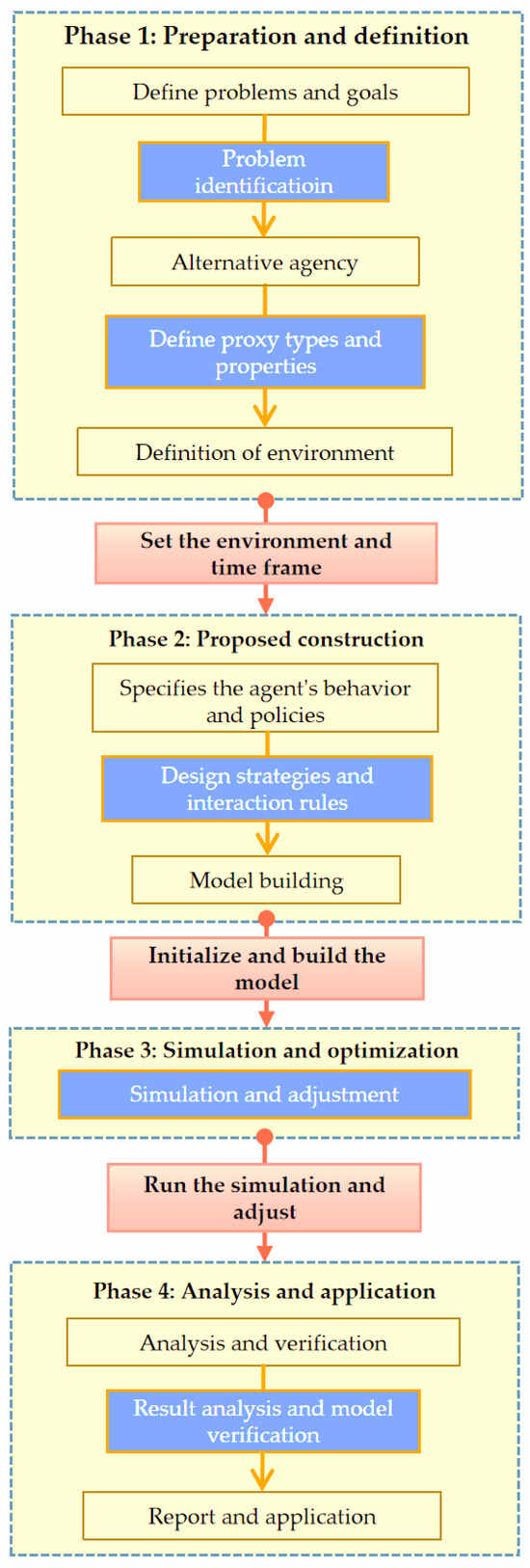 Figure 3 provides a visual representation of the model-building process []. It starts with the definition of the problem and objectives, followed by agent selection, behavior specification, and interaction rules. The simulation is then run iteratively, with results analyzed in the final step.