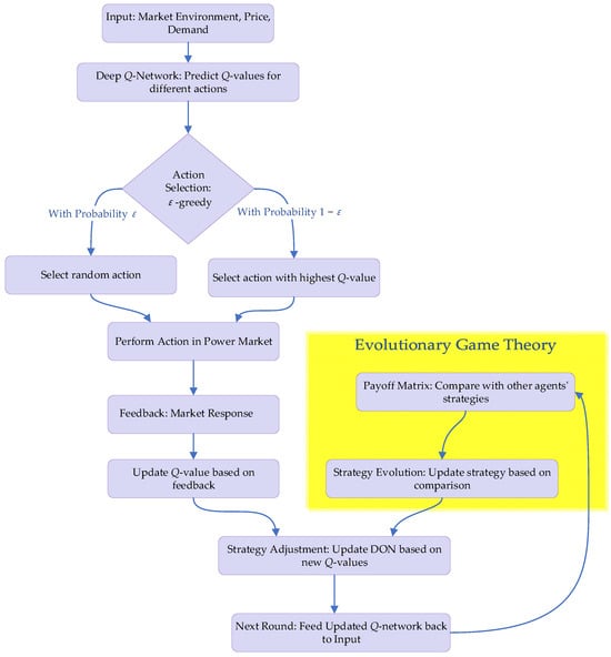 To address these challenges, integrating deep reinforcement learning (DRL) with EGT offers a promising solution by combining the strengths of both approaches. DRL provides a powerful tool for real-time strategy optimization, enabling market participants to adapt to fluctuating conditions effectively. DRL allows agents to interact continuously with their environment, learn from these interactions, and update their strategies in a manner that maximizes cumulative rewards. Unlike traditional methods, DRL uses neural networks to approximate value functions or policies, which makes it particularly effective in dealing with the high-dimensional state and action spaces characteristic of modern energy markets. This allows DRL to efficiently handle the complexity that comes with multiple market participants, dynamic pricing, and the integration of renewable energy sources.