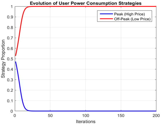 Another significant feature is the autonomy of smart grid agents. These agents operate independently, making decisions based on their specific objectives and constraints []. A prominent example is real-time pricing, a core mechanism within smart grids, where electricity prices fluctuate based on supply and demand conditions [,]. Take the application of evolutionary game coordination in islanded microgrids as an example []. In this example, the integration of distributed generation game theory plays a crucial role in designing pricing models that incentivize consumers to reduce their electricity usage during peak periods []. By simulating various consumer responses, this approach allows power producers to assess price sensitivity and optimize their generation strategies. As shown in Figure 5, over time, more consumers adopt energy-saving strategies, reducing overall electricity demand and smoothing a peak load, which enhances the system’s economic and operational stability [,].