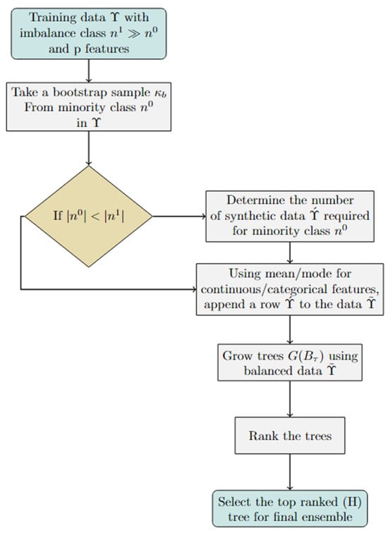 Assume that the given training data come with a severely skewed class distribution, i.e., . To balance the training data before building the tree ensembles, the following procedure is considered. The dataset, i.e., Υ is balanced by adding observations, where = by selecting bootstrap samples, each having the size of the minority class observations, i.e., . Let the sample be , where v = 1, 2, …, . Each bootstrap sample has observations and p features. The bootstrap samples included both continuous and categorical features; computing the means and modes of the features gives a vector of observations, i.e., . Each bootstrap sample is employed to add a row to the data by calculating the mean of each numeric column and the mode of each categorical column. In the generated matrix, the rows represented the bootstrapped samples, and each row contained elements arranged in the original order of features. The last column of the matrix contained the class labels of the minority class, denoted as, , where r = 1, 2, …, p; that is,