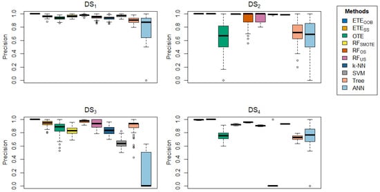 To ensure consistent comparisons, the same training and testing data were used across all models, including , , OTE, , , , k-NN, SVM, tree, and ANN model performance was evaluated using two metrics: classification error rate and precision. All experiments were conducted in R version 4.3.1 on a 1.30 GHz Intel Core i5-1235U with 8 GB of memory, running on a 64-bit operating system.