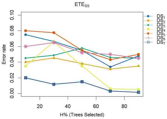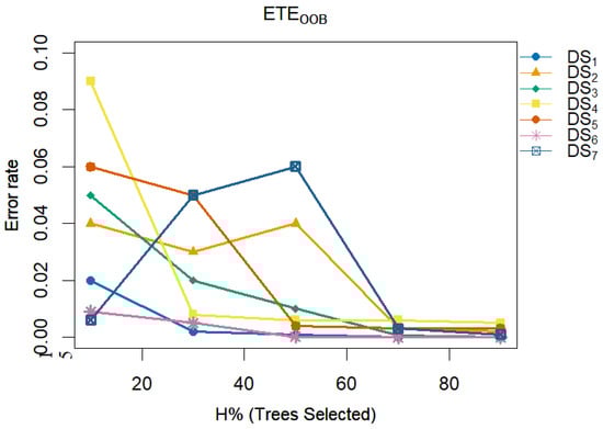 denotes the tree with the lowest error, the second-top-ranked tree (), …, with being the H-th best tree based on the classification error in the list of trees based on their classification error values, as shown in Equation (7):