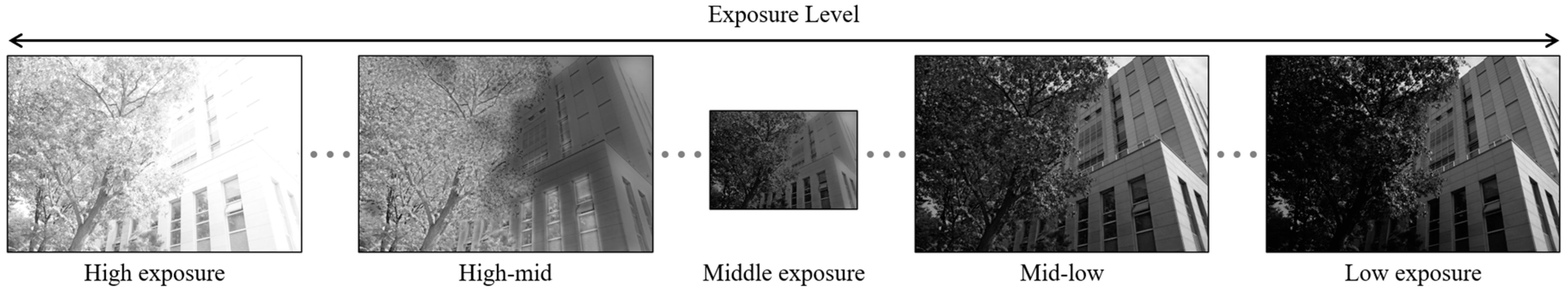 - To address halo effects that occur between bright and dark areas when using a limited number of multi-exposure images without reference images, we estimate the ME image to preserve boundary information and generate high-mid and mid-low images to reduce the exposure gap.