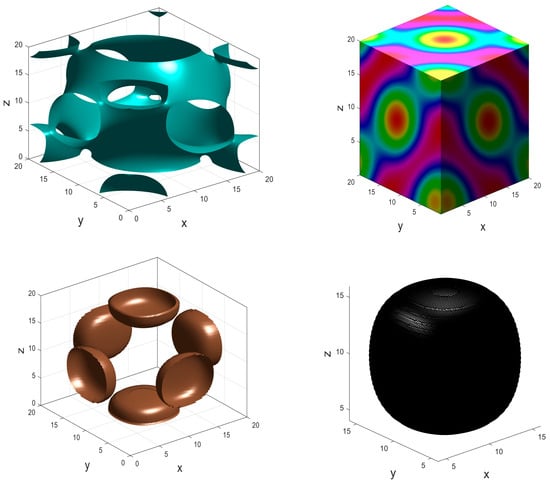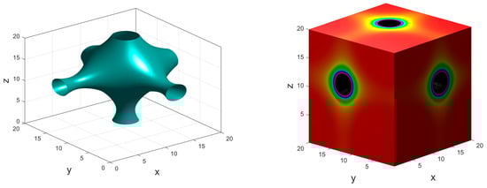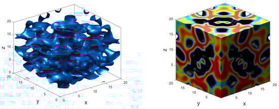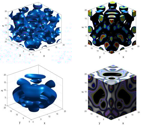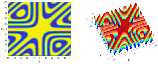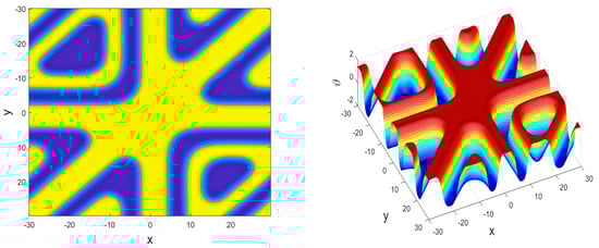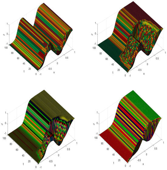 Figure 4, Figure 5, Figure 6 and Figure 7 illustrate the numerical solutions of the KPP–Fisher Equation (36) in one, two, and three dimensions. The 1D dynamics show a stable spatiotemporal evolution, as depicted in Figure 4 (see caption for details). The 2D dynamics resemble the Allen–Cahn distribution due to similarities between the two equations. Simulations with the initial Conditions (41) and (42) produce the results shown in Figure 5 and Figure 6, respectively. The complex dynamics of the 3D evolution, starting from the initial condition in (43), are presented in Figure 7.