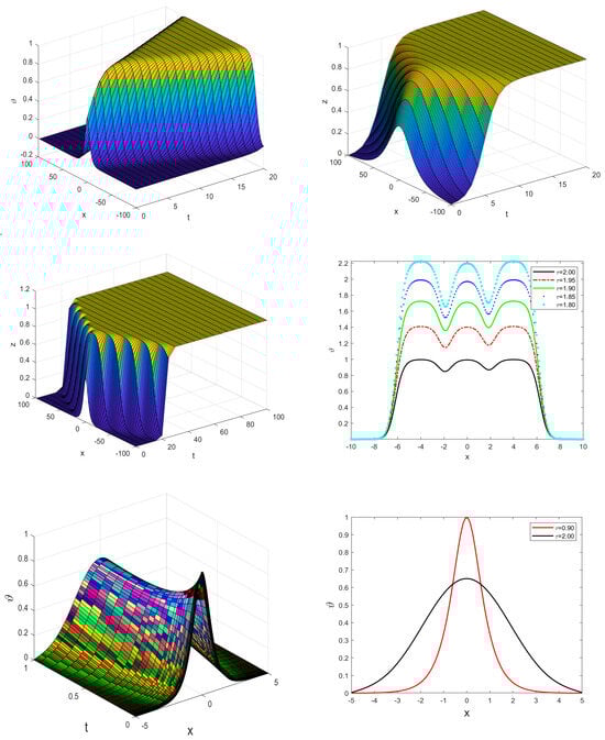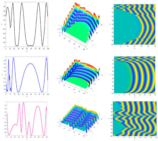 Furthermore, we present numerical results for the fractional complex Ginzburg–Landau (CGL) Equation (38) as displayed in Figure 8, Figure 9, Figure 10 and Figure 11. Finally, numerical solutions for both instances of time and fractional parameters are given in Figure 12. The CGL equation is known for its oscillatory and spiral distribution behavior; this is evident in the 2D and 3D dynamics.