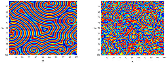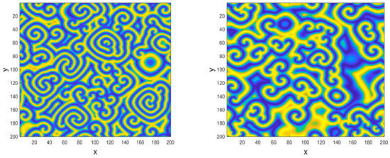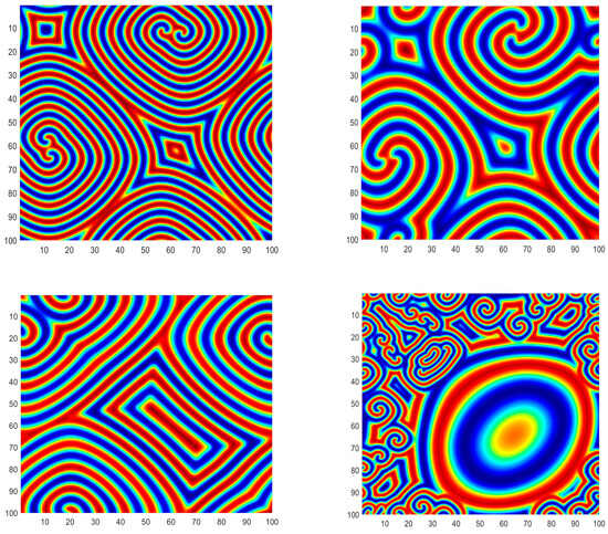 The Ginzburg–Landau equation is a cornerstone in the study of nonlinear dynamics and pattern formation, as evident in Figure 8, Figure 9, Figure 10 and Figure 11. Describing the evolution of disturbances near a finite wavelength bifurcation provides a powerful framework for understanding how complex structures emerge in a variety of physical, chemical, and biological systems. Its applications span numerous fields, making it a versatile and essential tool in both theoretical and applied research.