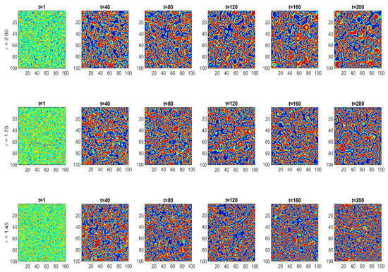 Numerical results in 2D obtained for some final simulation time t = (1, 40, 80, 120, 160, 200) and different instances fractional order = (1.45, 1.75, 2.00) for Ginzburg–Landau equation.
