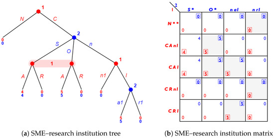 The publicly available game theory exploration tool GTE (Game Theory Explorer: http://app.test.logos.bg/ (accessed on 20 July 2024) published in [20] is used to build the game trees and the corresponding game matrix. Figure 3 and Figure 4 show extensive and strategic forms of the respective SME–consultant and SME–RI interactions generated in the game. The colour red and number 1 in both games (Figure 3 and Figure 4) denotes the actions of SME. The colour blue and the number 2 in the first game (Figure 3) denote the consultant’s actions while the in the second game (Figure 4) denote the actions of the research institution. In the first game, an SME can either create (C) or not create (N) a project. A consultant can respond by proposing matchmaking with other users (M) or offering (o) to directly collaborate with the SME. Regardless of the actual response of the consultant, the SME can accept (a) or reject (r) the collaboration offer or the suggested matchmaking. For the second game, the SME creates or does not create a project. The research institution can respond by offering a collaboration (O), or offering a service (S) or doing nothing (n). For the collaboration request or service request, SME can accept (A) or reject (R). However, if there is no response from the research institution, the SME can invite (I) the research institution to collaborate or not respond (n1). However, the SME collaboration invitation can be accepted (a1) or rejected (r1) by the research institution.