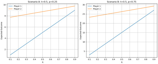 Equations (6) and (7) represent the total tokens earned by Players 1 and 2 in the first game. Suppose that SMEs will accept requests from other parties solely based on their reputation and that at least half of the platform membership consists of reputable research institutions and consultants. Hence, the value can be assigned . In the first scenario, represents the situations where SMEs join the platform but are less likely to create project requests. In the second scenario, represents the situations where SMEs join the platform and are willing to create project requests. Both scenarios represent lower and upper quartiles of p. Equations (6) and (7) are then simulated for the values of q, where . The assigned numbers represent various probabilities of the variables in the equations.