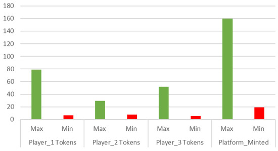 By playing both games simultaneously, it is possible to estimate the minimum and maximum amount of tokens that each player can earn for both games. For example, Player 1 earns tokens both in G1 and G2. The total amount of tokens minted by the platform can also be estimated on a given number of unique interactions between various types of user. The boundaries_sum in Table 1 shows the estimated maximum and minimum amount of tokens for each player by summing the G1_boundaries and G2_boundaries. Therefore, Figure 7, generated from Boundaries_sum, represents the total possible tokens for each player and the platform that separately combines the minimum and maximum tokens earned in both games. Hence, the average token distribution on the platform can be estimated.