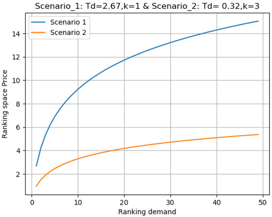 Here, represents the token distribution on the platform, which is the average amount of tokens in each user’s wallet based on the total tokens in circulation. Hence, can denote high and low token inflation on the platform. K represents the scaling factor, where the ranking price can be a multiple of average tokens in the platform user’s wallet. Given that the demand for minimum ranking space is such that there is only a single demand for ranking space for a single day , in that case, the demand for ranking space is . Therefore, the scaling factor K can determine the token price of the ranking space relative to the average token balance in the users’ wallets.