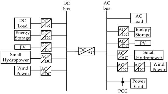 The architecture of a microgrid underpins its operational safety and ensures the energy system’s flexibility and resilience. These qualities are vital during the construction, operation, and maintenance phases of the microgrid. Microgrids are currently categorized into three types based on their characteristics: DC, AC, and AC/DC hybrid microgrids []. The prevalent structure in rural microgrids is the AC/DC hybrid microgrid [], encompassing both AC and DC buses. This configuration forms AC and DC sub-microgrids, facilitating bidirectional power flow via bidirectional converters. It melds the benefits of both the AC and DC microgrids; the AC/DC hybrid microgrid is capable of simultaneously powering AC and DC loads, thereby minimizing the power conversion losses. Its ability to operate independently or integrate seamlessly with larger power grids enhances its reliability. Consequently, the AC/DC hybrid microgrid presents extensive development potential []. The architecture of the AC/DC hybrid microgrid is illustrated in Figure 1.