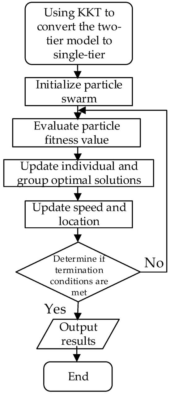 The transformation of the two-tier programming model into a unified single-tier programming framework is achieved by applying the KKT conditions. This reconstructed single-tier planning model has Equation (7) as the objective, and (8) to (12) in the original upper constraints and (27) to (29) in the original lower constraints are made into the constraints of the single-tier planning model.