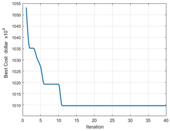 The rural microgrid construction plan delineated in this study, Scheme 3, thoughtfully balances business costs and customer satisfaction by using 17 PV sets and 12 wind turbines. Since the increase in customer satisfaction is smaller when the basic needs of the customer are met by additional equipment, a higher increase in customer satisfaction can be obtained by increasing the amount of equipment by a smaller number of units only. This design endeavors to achieve a harmonious equilibrium between cost efficiency and customer satisfaction, positioning it as a strategic compromise between Scheme 1 and Scheme 2. Most rural microgrids, in practice, are developed using schemes that prioritize minimizing the total cost to the enterprise [,]. However, the method proposed in this study considers both the enterprise costs and user satisfaction. Compared to the cost minimization strategy, two sets of photovoltaic and four sets of energy storage devices were added, the costs of construction increased by USD 605,475, resulting in an 8.4% increase in user satisfaction. The total cost increased from USD 9,424,020 to USD 10,100,220, an increase of 7.1%. On average, an increase of USD 96,600 can increase user satisfaction with electricity services by 0.01. Additionally, the utility value, defined as the ratio of user satisfaction to total cost, is significantly higher in the proposed scheme. This analysis suggests that, compared to the conventional rural microgrid construction schemes commonly implemented, the proposed model offers considerable improvements in balancing cost efficiencies and user satisfaction, potentially revolutionizing rural electrification strategies. While Scheme 3 may not reach the pinnacle of optimization in either domain, it offers a viable compromise that ensures a considerable degree of customer satisfaction. Despite not attaining optimal results in either aspect, Scheme 3 introduces a pragmatic compromise, facilitating enhanced customer satisfaction at a reduced investment cost for the enterprise. This approach bears significant implications for fostering positive enterprise–user relations and proves more apt for practical implementation. The convergence curve of the particle swarm algorithm is shown in Figure 5, and the calculated optimal value of the firm’s cost is USD 10,100,220.