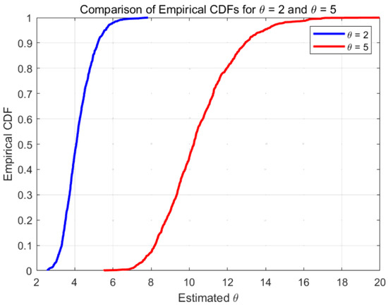 As part of this study, we conducted a simulation analysis on two exponential populations with parameters and . We employed censored data with a predetermined number of failures to obtain the maximum likelihood estimator . For each of these two exponential distributions, 50 experimental units were tested and the required sample data were recorded to apply this method. This experiment was repeated 1000 times. Based on the 1000 values of corresponding to each population under this method, the empirical cumulative distribution functions (ECDFs) of were calculated.