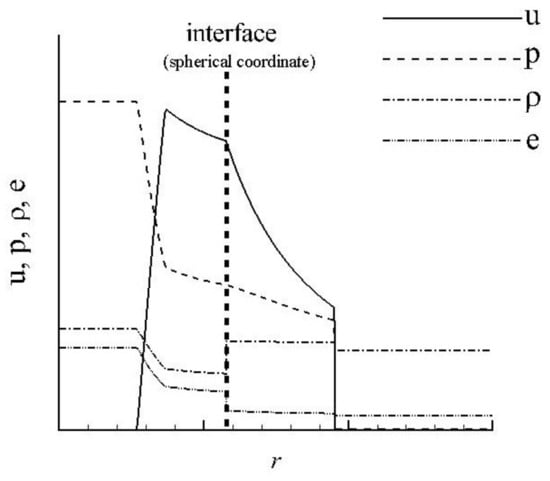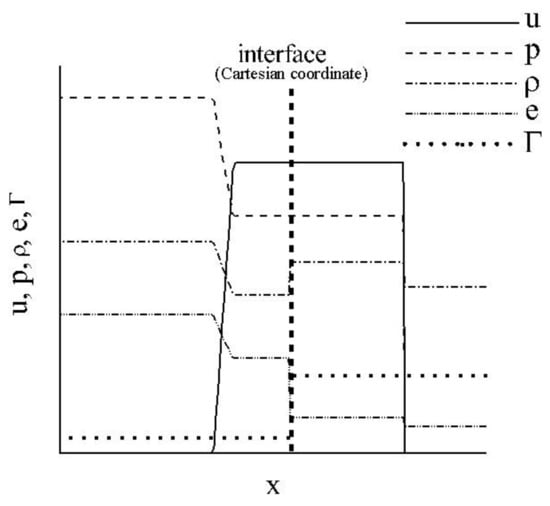 At the interface position, the structure of the solution shows that density, energy and other material-dependent coefficients are discontinuous across the interface. However, the pressure and particle velocity of each component remain continuous at the interface [8,37], as shown in Figure 2. Otherwise, entropy would be created as soon as the pressures or velocities are different for gas and water [38]. Here, we consider the energy conservative law of (8):