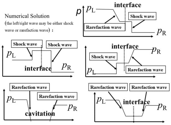 Meanwhile, at the left/right wave, the pressure and velocity are discontinuous, which means that there is no (25). Note that the left/right wave is separated from the interface and the wave is composed of a single form of fluid, as shown in Figure 3 (a total of five kinds of solutions). In Figure 3, the rarefaction wave corresponds to a weak discontinuity [39]. Thus, the following deduction can be made for :