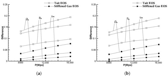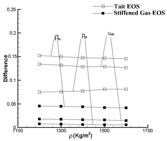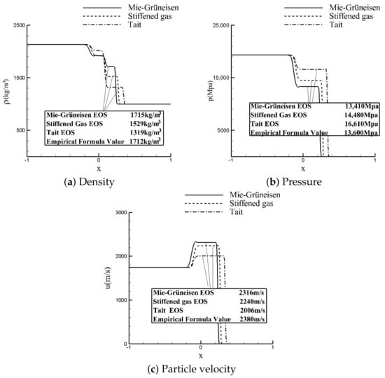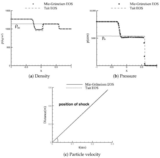 Figure 4 exhibits the curves of density and pressure, as well as the shock velocity position records. From the comparison, it is noticed that the difference between the two kinds of EOSs is minimal. In the pressure curves shown in Figure 4b, the shock wave pressure of the Tait EOS is slightly higher than the Mie–Grüneisen EOS. It seems that the Tait EOS can also achieve excellent solutions even though it is in a simple form. Figure 4c provides the trace of shock sections, which corresponds to the discontinuous sections at the right side of Figure 4a,b. However, the analytic solutions can be easily obtained using the Tait EOS in calculation. Still, it is hard to deduce analytic solutions for the Mie–Grüneisen EOS. Therefore, some other referential data are needed here to check the solution of the Mie–Grüneisen EOS.