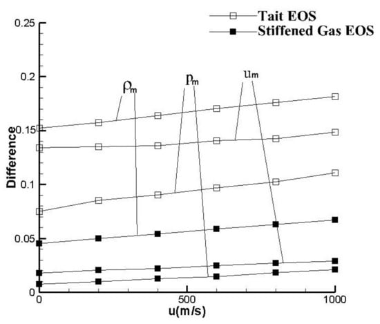 - Affected by the fundamental theory of an EOS, the deviations of shock wave parameters are different. The order is from high to low. The reason lies in the calculation process of the three parameters: depends on the medium itself, as well as the initial density and pressure; is affected by according to a couple of characteristic formulas; and lastly, there is .