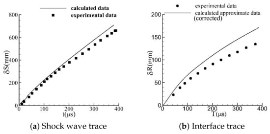 The motion of shock and interface in spherical gas–water interaction problem. (a) The trace of a shock wave and (b) the trace of the interface.
