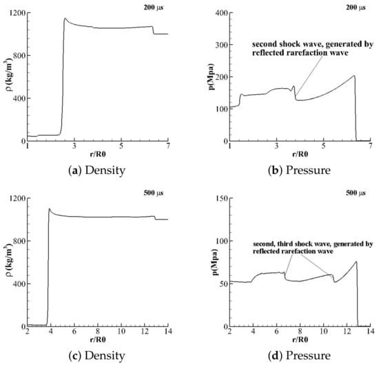 In Figure 11, the curves of water density and pressure at instants and 500 s are posted. The profiles show the states when the main shock wave travels a long distant. In the beginning, the main shock wave spreads outside. On the other hand, a rarefaction wave moves backwards to the center. The cumulated rarefaction wave then becomes the second shock wave. Afterwards, yielding to the same mechanism, the third shock wave is generated. However, the shock wave generated at the second stage is much lower than the main shock wave, as shown in Figure 11. Regardless, compared with discontinuous parameters such as , the velocity and pressure are not constant but are still kept continuous. So, the Mie–Grüneisen mixture model still make sense here.