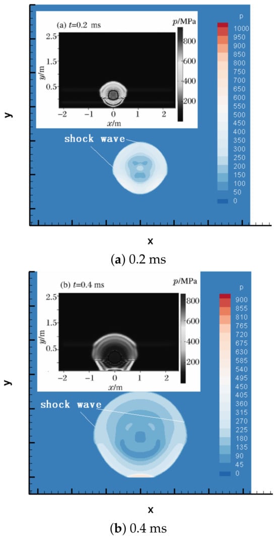 Although the gas–water interaction and gas–sand interaction are coupled with each other and the whole interaction becomes complex, it is effective to take the three-phase field as a fluid mixture and use the Mie–Grüneisen mixture model to simulate the interaction process. The pressure contours of this three-phase interaction are given in Figure 12. In contrast, the work of Yao is used here to be a reference [45]. It can be observed that our results are approximate to Yao’s results. The discontinuous sections of shock waves in water and in sand are both clearly seen in the contours. The drawback of our results lie in the interface, which is not as distinct as Yao’s. This is because the interface is automatically captured and not modified by another procedure.