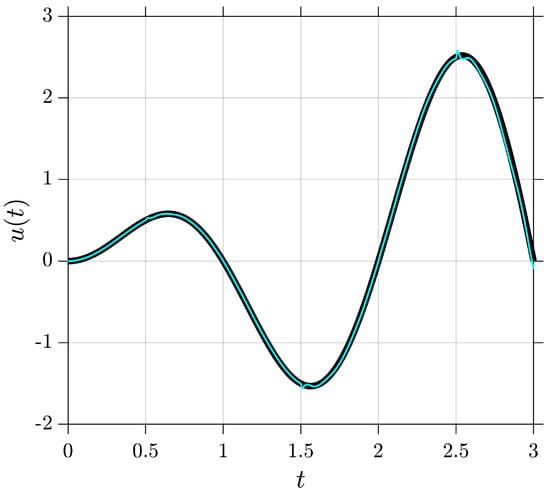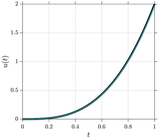 Comparison between the exact solution (black line) and the numerical approximation (light blue line) for Example 2, obtained using the proposed method.