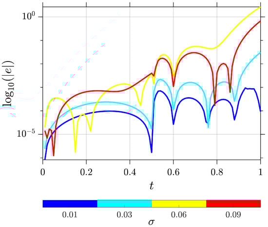 In addition, Figure 2 presents a logarithmic analysis of the absolute errors for the solution of the SFNDE in Example 1 plotted against varying noise intensities . The numerical scheme was implemented with the following parameters: discretization level , quadrature orders and , fractional order , time step , and Brownian motion realizations. This semi-log plot elucidates the sensitivity of the numerical approximation to stochastic perturbations of different magnitudes. The divergence of error curves for distinct values provides insight into the method’s stability and accuracy across a spectrum of noise intensities. This analysis is crucial for assessing the robustness and applicability of our numerical scheme in various stochastic environments, particularly when dealing with fractional-order systems subject to time-varying delays and nonlinear interactions. These results provide strong empirical evidence for the efficacy of our proposed method in approximating solutions to SFNDEs with time-varying delays, even in the presence of nonlinear terms and stochastic perturbations.