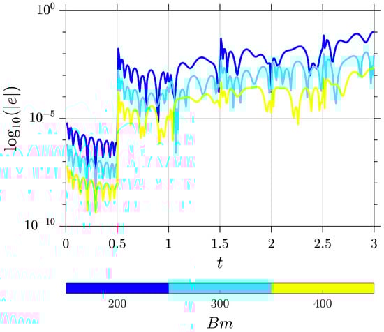 where . Due to Equation (16), the numerical solution , , satisfies in the equation