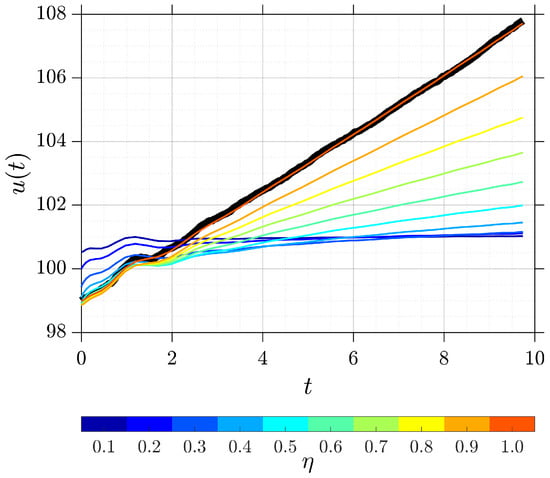 Figure 5 illustrates the simulation results for various values of with the numerical algorithm parameters set as , , , , and . The black line corresponds to the integer-order solution based on the approach from [], showing strong agreement with the proposed model at . Moreover, the obtained numerical solutions leverage the Martingale property of the stochastic process, implying that while the solution exhibits random fluctuations, it shows no deterministic trend or drift. Although these fluctuations are more pronounced in the integer-order solution obtained using the approach from [], they are less visible in the proposed method due to the use of a low-degree interpolating polynomial, which leads to a natural averaging effect. Additionally, as the fractional order decreases, an exponential decline in the growth rate is observed, consistent with the theoretical expectations for such systems.