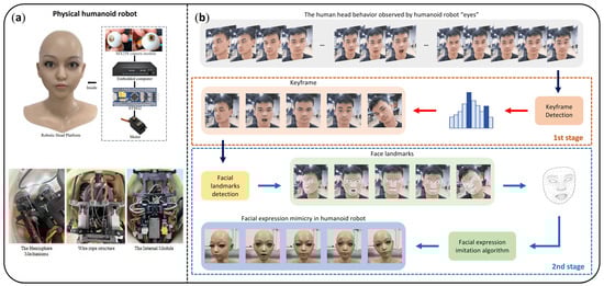 (a) The humanoid robot’s physical platform utilized in this work. The robot contains 16 servos whose driving combinations produce varied facial expressions (see Appendix A for details). (b) The overall process of expression imitation for the humanoid robot. Unlike previous humanoid robot facial expression imitation [9,10], we use a keyframe detection model for acquiring key expression frames in video sequences. By placing this model before facial keypoint detection, it is able to adaptively select key expression frames to alleviate the jittery expression imitation problem of the humanoid robot.