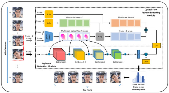 Overall architecture of the facial keyframe detection method. The framework mainly contains two modules: an optical flow feature extracting module and a keyframe detecting module. The optical flow feature extracting module is responsible for extracting multi-scale features from input frames. The keyframe detecting module is responsible for extracting features from the input frame, and combining the features and multi-scale optical flow features to score the amplitude of facial expression changes in the frame. Finally, keyframes are selected according to a certain strategy based on the score.