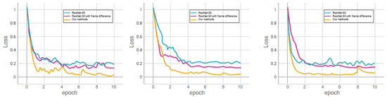 In the experiments, we compared three different facial expression keyframe detection methods: the ResNet-50 network [43], the ResNet-50 network with frame difference [44], and our own method. In terms of the ResNet-50 network with frame difference, this means the input of the ResNet-50 network is the image obtained by subtracting adjacent frames. The inputs of the remaining methods are all original video frames. By applying these strategies, we aim to evaluate their performance differences in the task of human facial expression keyframe detection. We especially focus on comparing the loss values of these strategies. Our own method has the lowest loss value during training, as shown in the Figure 3.