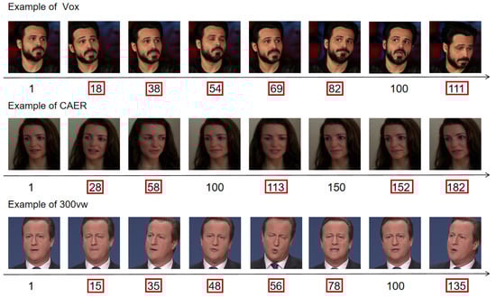 Figure 4 shows some typical cases visualized using the output of the proposed human facial keyframe detection algorithm. We can observe that the keyframes detected by our method mainly correspond to the critical points of expression and head pose changes. This means that the localization of keyframes captures the essence of facial expression changes. This further confirms the effectiveness of our method in capturing human head behavior, providing more accurate and comprehensive information for human emotion analysis and human–computer interaction.