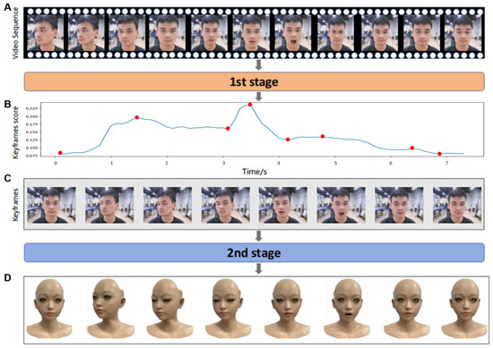 The complete process of humanoid robot facial expression imitation based on keyframe detection. (A) A video of facial expression recorded by classmates. (B) Importance score curve for each frame, with red dots marking key frames. (C) Keyframes selected from the video. (D) Expressions imitated by a humanoid robot.