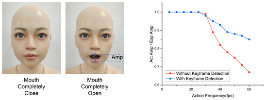Subsequently, we investigated the effectiveness of the strategy in mitigating the jittering or stuttering of the robot’s facial expression imitation caused by high-frequency data processing. We recorded a video of a participant’s mouth opening and closing and fed it to the robot at different frame rates to have the robot imitate the mouth movements. As shown in Figure 6, in the absence of keyframe detection, the amplitude of the robot’s mouth opening and closing decreases as the frequency increases. This is because the servo has not completed executing the current command before a new command arrives, causing the servo to begin executing the new command prematurely. After incorporating keyframe detection, this issue was alleviated, allowing the robot to execute commands fully even at higher frequencies. This demonstrates that our strategy is effective in mitigating the issue of jitter and stuttering in the robot’s facial expression imitation caused by high-frequency data processing.