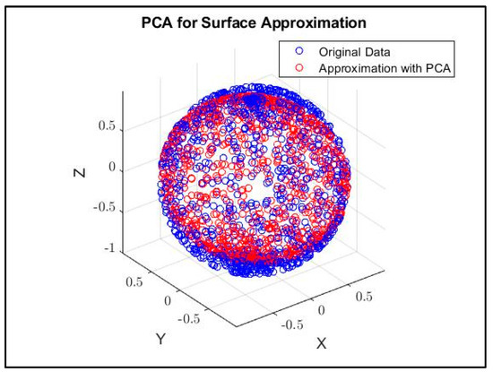 Figure 2 shows an approximation of the surface of a sphere using the PCA approach. The calculations and visualization were performed in MATLAB. A total of random points from the sphere (in blue) were generated and used to form the input matrix . The dimensionality of is , where is the number of features (coordinates) of each point.