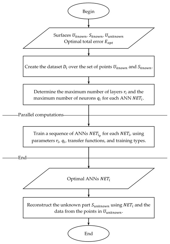 Our proposed algorithm is based on the assumption that it is possible to find a continuous mapping of the -dimensional domain , into points on the geometric locus of the -dimensional hypersurface , i.e., . To search for the analytical representation of the mapping , using its three coordinate functions, we employ ANNs. The training of the ANNs is conducted on a dataset formed from points of the known surfaces and . The reconstruction of the unknown part is carried out through approximation, using the created ANNs and the data for points from .