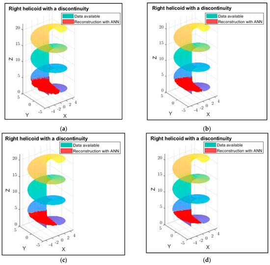 The experiments conducted in this study confirm the initial idea that surface reconstruction in 3D space can be performed relatively effectively when separate ANNs are used for each spatial direction. The results indicate that for linear coordinate functions, such as the case of points on a plane, or for example, of the right helicoid, approximation in the respective direction is easily handled by one or several neurons with a linear transfer function or ReLU. For more complex coordinate functions, it becomes necessary to adjust the type of ANN and increase the complexity of the architecture. Nevertheless, the combined work of the three ANNs leads to an effective reconstruction of the missing surface details.