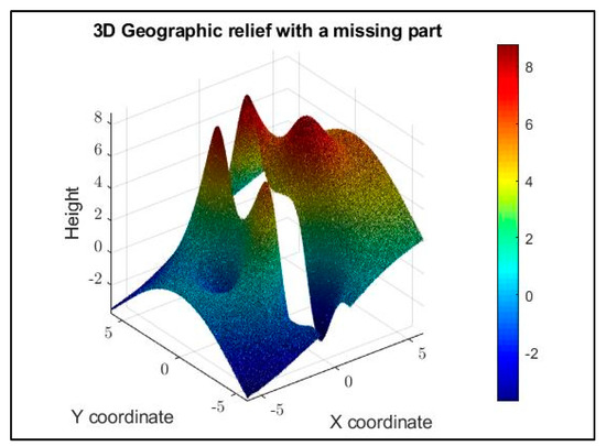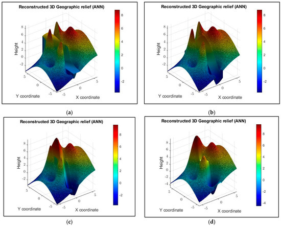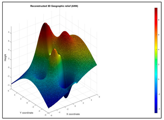 The experiments conducted showed that the spatial direction of the terrain experiencing the most frequent and significant undulations requires the most complex architecture. In the given example of the simulated mountainous terrain, the most challenging for approximation is the third coordinate (), which provides information about the elevation of the terrain. Nevertheless, the overall for the three ANNs used in the scheme is on the order of . Even visually, the color bar indicates excellent approximation in terms of elevation, with the reconstructed points having elevations very close to the neighboring known points. In specific numerical terms, the approximation for the coordinate yields an .