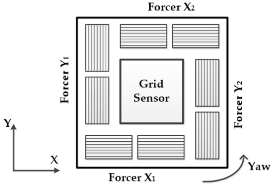 Planar motors have been studied and developed for use in high-precision motion systems due to their reliability, low friction, high position resolution, rapid acceleration, and high-speed motion [1,2,3,4,5,6]. However, open-loop microstepping control can experience step-outs, longer settling times, and poor disturbance attenuation. These problems are closely related to yaw control and degraded performance. The motor consists of two-axis X-Y directions that generate four forces mounted symmetrically on the housing part [3]. The forcers X1 and X2 generate force along the X axis, while forcers Y1 and Y2 generate force along the Y axis, as shown in Figure 1. The yaw of the motor is generated by asymmetries in the forcers and leads to a loss of synchronization between the motor and platen teeth. In addition, the motor exhibits 14th-order dynamics with complex nonlinear properties. The motor therefore requires high resolution for position control.