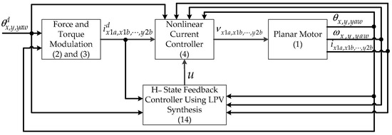 The block diagram of the proposed control method is shown in Figure 2. The proposed method consists of force and torque modulation, a nonlinear current controller, and an H∞ state feedback controller based on LPV synthesis.