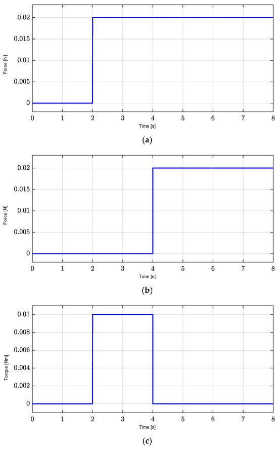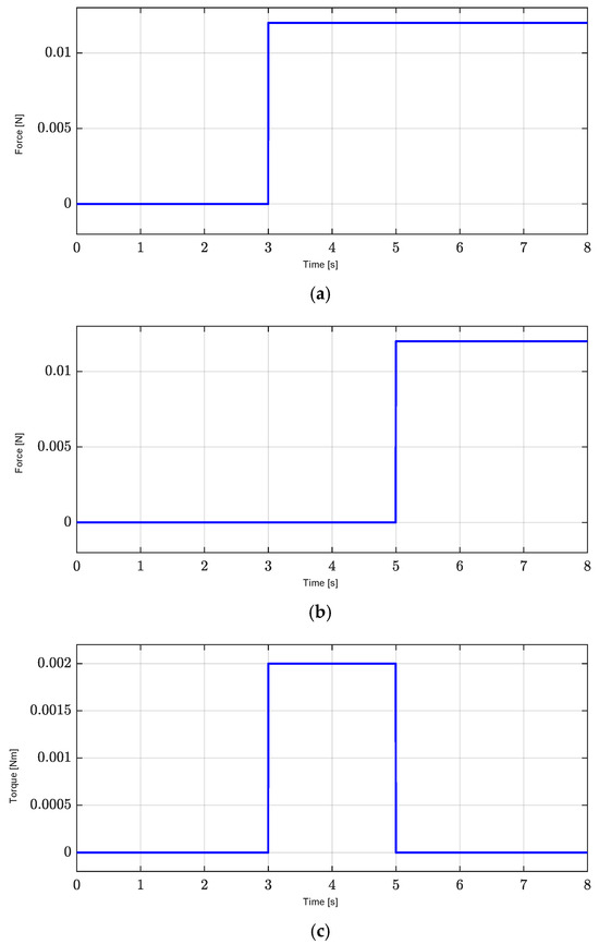 Exogenous disturbance. (a) X-axis exogenous disturbance, , at 2 s. (b) Y-axis exogenous disturbance, , at 4 s. (c) Yaw exogenous disturbance, , with a period from 2 to 4 s.