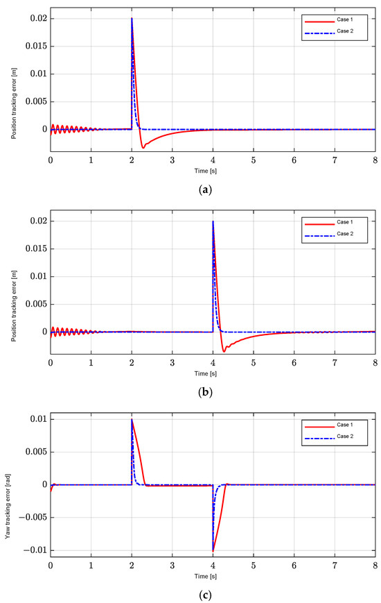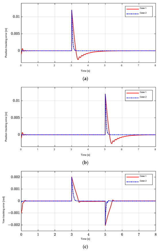 On the other hand, due to the fact that the controller also uses the interpolated gain scheduling in Equation (13), as shown in Figure 12, to regulate the position-tracking errors, and the effectiveness of H∞ control is also ensured by using the H∞ norm in Equation (11), the yaw motion in Case 2 is also controlled more effectively than in Case 1 under the influence of exogenous disturbances to the load torque in Figure 11c.
