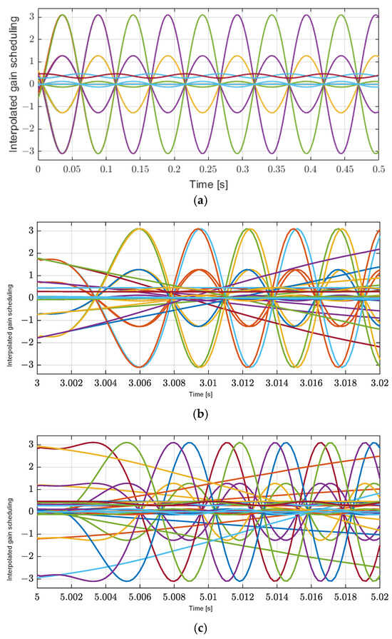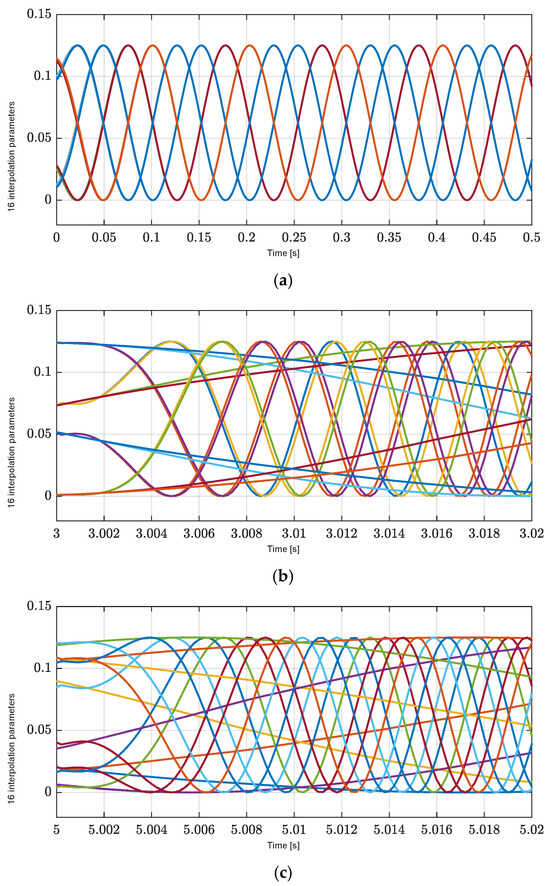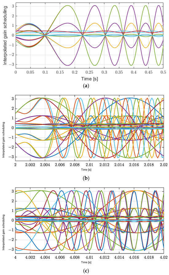 Sixteen interpolation parameters for each polytopic decomposition. (a) Zoom-in of the X axis at the start time of interpolation parameters. (b) Zoom-in of the X axis at 2 s of interpolation parameters. (c) Zoom-in of the X axis at 4 s of interpolation parameters.