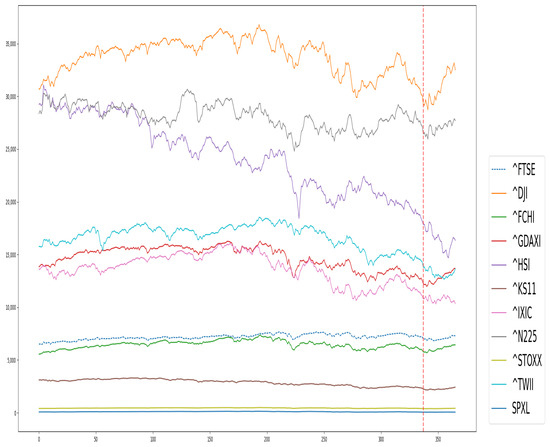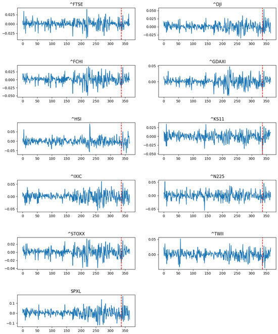 Here, we use the daily stock close index data of FTSE, DJI, FCHI, GDAXI, HSI, KS11, IXIC, N225, ST0XX, TWII, and SPXL from 2 February 2021 to 9 November 2022 as the raw data and let 23 September 2022 be the intervention date when the mini-budget was delivered as a ministerial statement by the then Chancellor of the Exchequer, Kwasi Kwarteng. All the stock market datasets are collected from Yahoo Finance using the Python package “yfinance”. The stock price indexes are shown in Figure 1, where the red vertical line represents the intervention time. We observe from this figure that most of the series are non-stationary. To make these series stationary, we transfer the daily stock price data into daily return data through r t = ( P t P t 1 ) / P t 1 , where P t and P t 1 are the daily closing prices of the index on day t and t 1 , respectively. The time series of the daily return data all look stationary as shown in Figure 2.