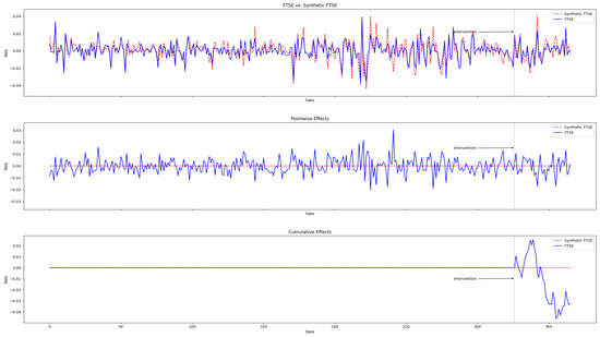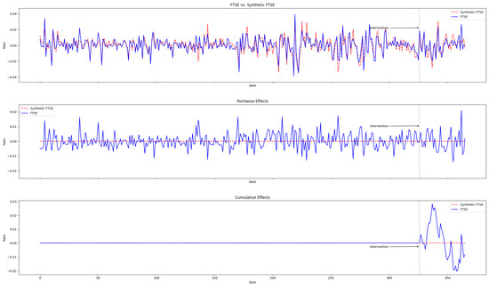 By applying conventional synthetic control method, which balances both the stock index daily return and the corresponding interest rate, we could obtain the synthetic weights and estimate the potential daily returns of FTSE in the absence of the effect of mini-budget policy after its implementation time. Based on the synthetic control result, only FCHI and STOXX are selected from the 10 control indexes to synthesise FTSE with estimated synthetic weights 0.6534 and 0.3465, respectively. In detail, the potential outcomes of FTSE after intervention could be estimated by: