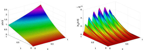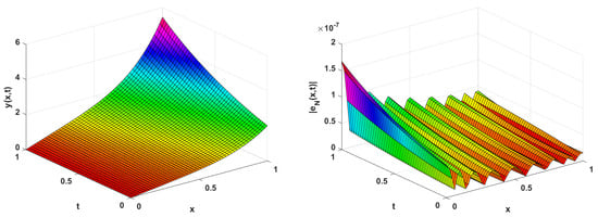 Plots of the approximate solution and corresponding error, where and (Example 2).