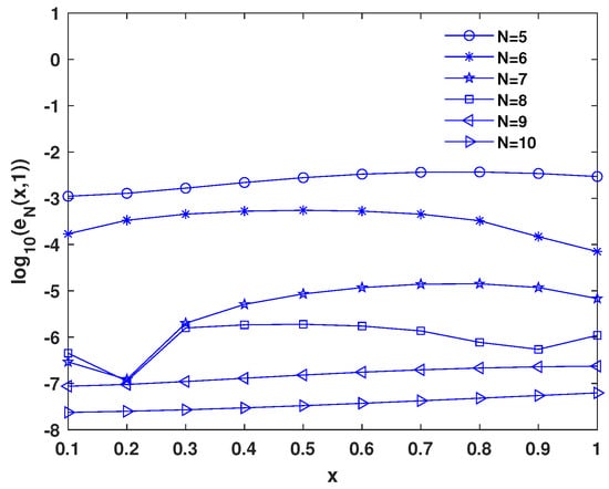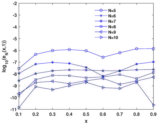 The capability of solving fourth-order FDWEs is showcased in Table 3 through the presented method. We tabulated Table 4 to confirm that the method is convergent. Increasing the number of bases (N) reduces error. Also, in this table, we report the CPU time. Table 5 is reported to compare the presented method with CCNFDM [20]. Our scheme gives better accuracy than CCNFDM, and it requires fewer calculations. Figure 4 illustrates the approximate solution and corresponding absolute error, taking and . We plot the absolute errors at , obtained for different values of N, in Figure 5.