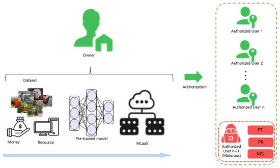 As the SSL intensively relies on data and computing resources, only tech giants can deploy well-trained pre-trained models in the cloud and provide MLaaS (machine learning as a service) [7] through charging users (e.g., Google Cloud and Microsoft Azure). Consequently, infringement leads to economic loss for the model owners. One case is that someone steals the pre-trained model by using stealing attacks and then re-deploys the models to obtain illegal profit. Accordingly, a watermarking-based strategy for protecting the model’s copyright is proposed: the model is watermarked, and once the model is suspected, the watermark will be extracted from the model to verify whether it is a pirate model [8,9,10]. The other case is that some individuals are authorized to use the pre-trained models; however, some of them unlawfully release the model or resell the model for illegal profit, as shown in Figure 1. Therefore, once a suspect model is discovered, it is necessary to trace the source of the model; more specifically, if the suspect model is pirated, it is necessary to attribute it to a specific authorized user who may be the pirate. Unfortunately, the method previously proposed to verify pirated models cannot trace the model, because the watermark is not uniquely embedded into individual models. This indicates that each model must be fingerprinted to link it with each authorized user. In addition, to reliably trace the model, the fingerprint must be robust to pruning, fine-tuning, and even model stealing attacks launched by the malicious user.